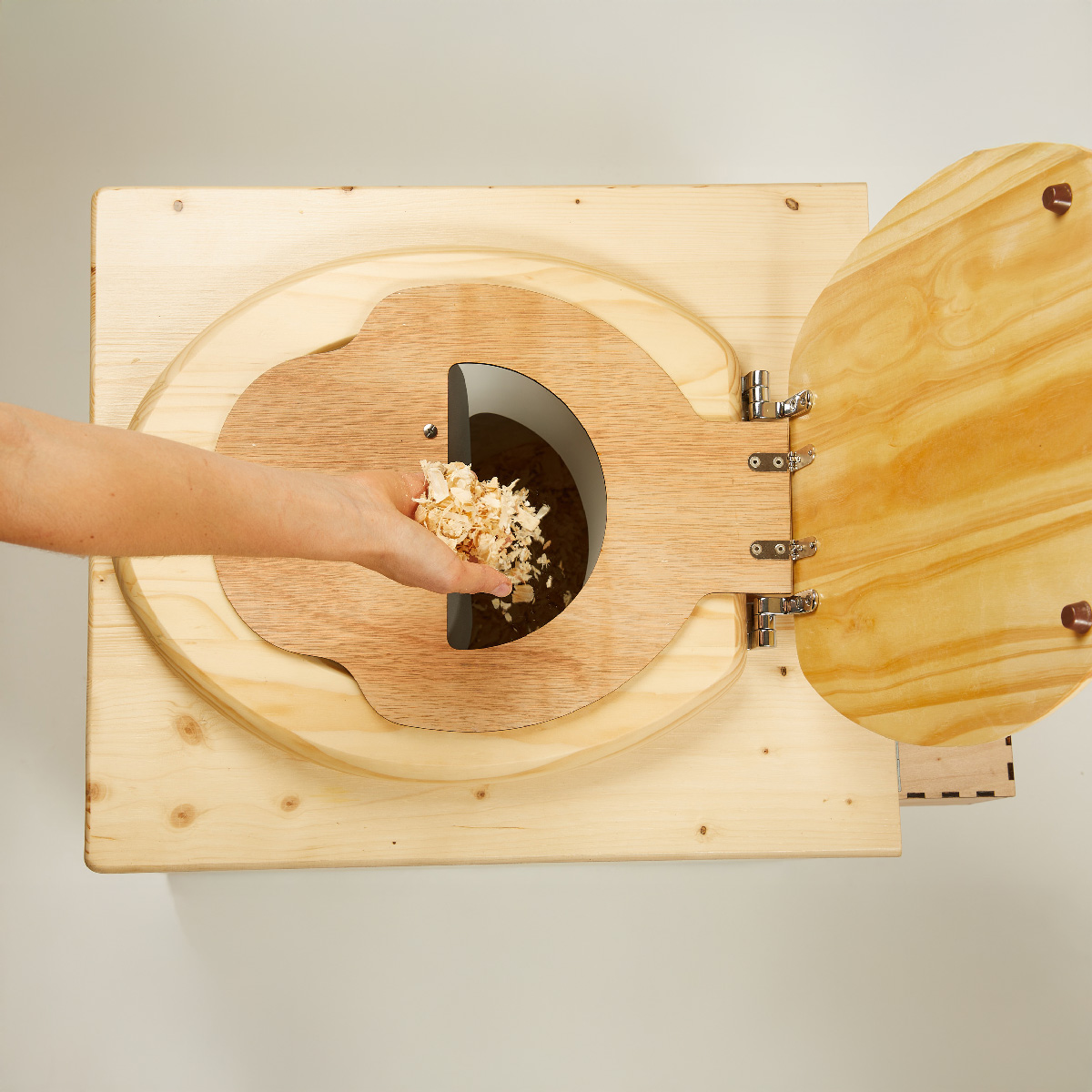 - Sans ventilation : les odeurs sont neutralisées grâce à l’ajout de copeaux de bois, rendu simple et pratique par la bavette intégrée.